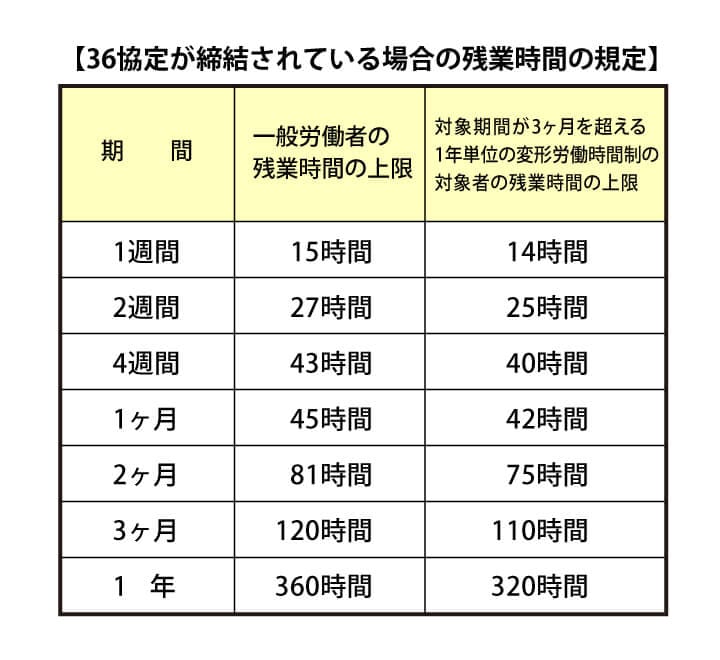 36協定が締結された場合は、以下のように残業時間のルールが適用されます。