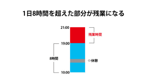 例えば、1日8時間の労働を、月曜日から土曜日まで続けた場合、労働時間の合計は48時間になりますので、8時間は「残業時間」になります。