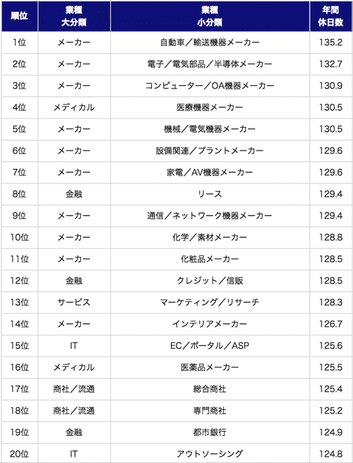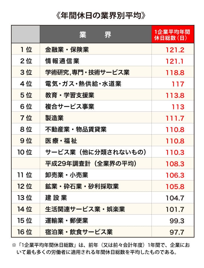 - 年間休日が105日以上の業種・105日未満の業種一覧
