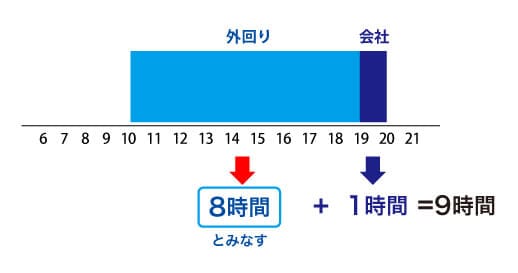 この場合、まず外回りの9時間について事業場外みなし労働時間制が適用され、「8時間働いた」とみなされます。