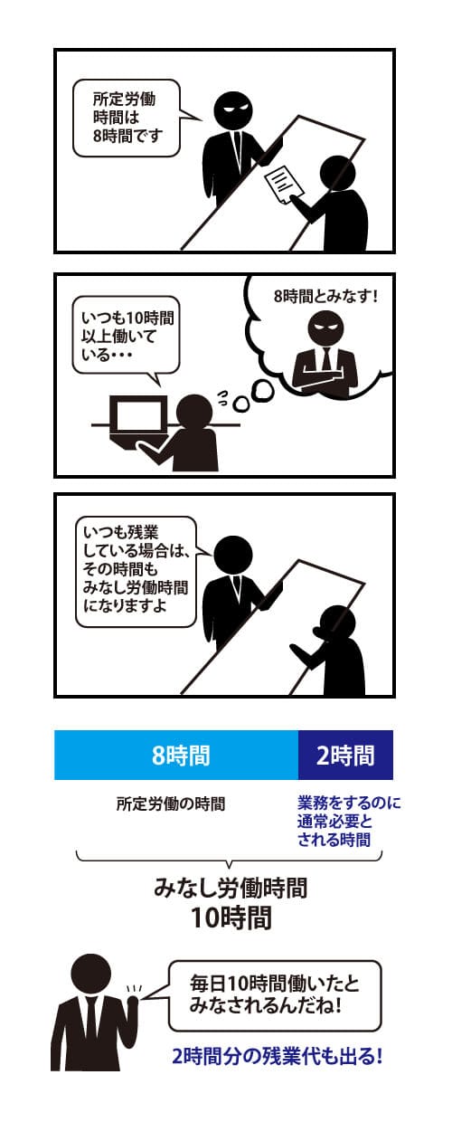 つまり、会社の所定労働時間が8時間とされていても、あなたの仕事が10時間かかるものであるなら、「10時間」をみなし労働時間としなければならないのです。