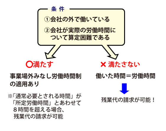 事業場外みなし労働時間制の条件を満たさない場合には、この制度を使うことはできず、働いた時間が労働時間になります。そのため、残業代を請求することも可能です。