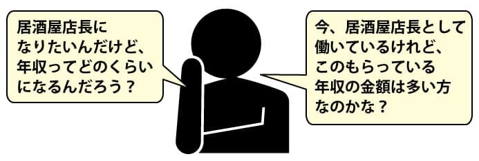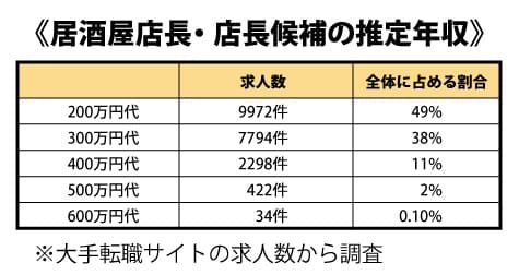 - 求人広告を見ると居酒屋店長の年収は200万円代〜300万円代がほとんどだと推測できる