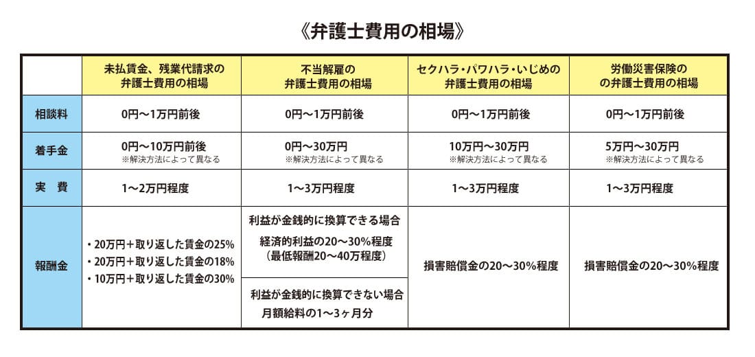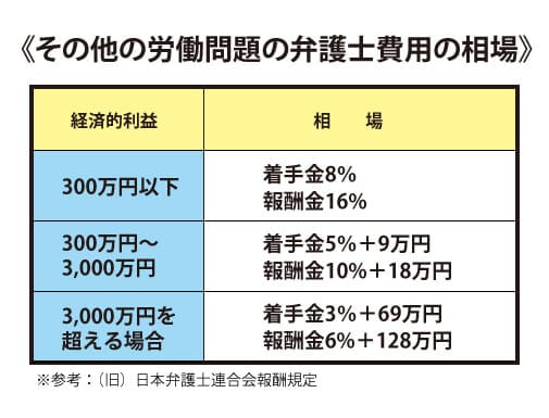 弁護士に労働問題の解決を依頼した場合、解決までにかかる費用の相場は、だいたい以下のようになります。
