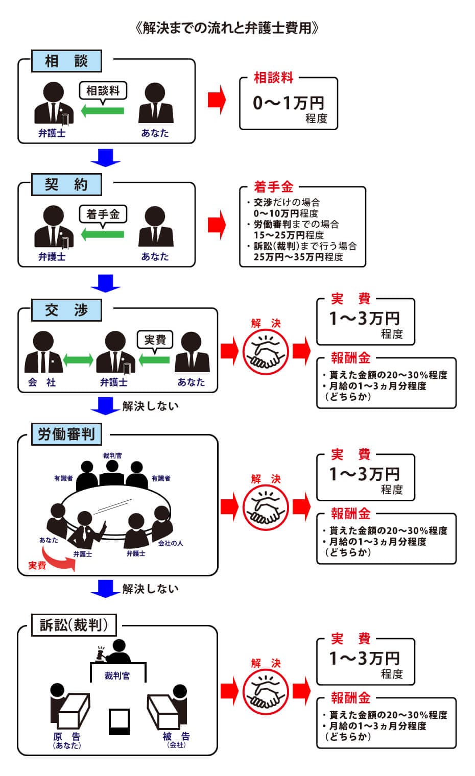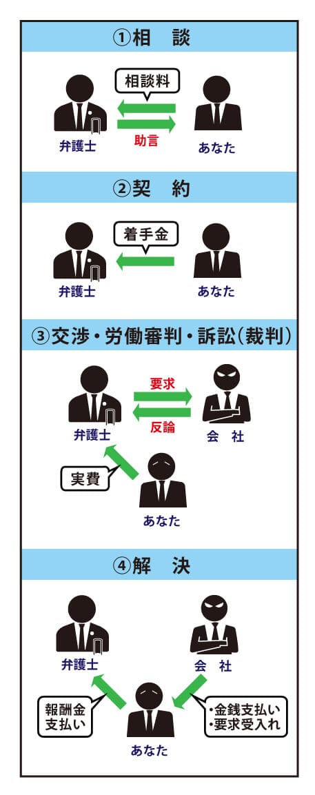 どのような労働問題であっても、弁護士に依頼した場合は以下のような流れで解決されるため、以下の種類の弁護士費用がかかるのが一般的です。