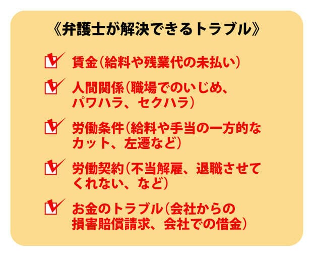 そこでこの記事では、まずは労働問題を弁護士への依頼で解決できることと、弁護士に依頼するメリット・デメリットを紹介します。