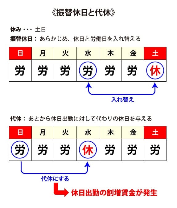 これに対し、「代休」というのは、社員を休日労働させた場合に、後から代わりの休日を与えることを言います。代休として与えた日は、賃金が発生しません。