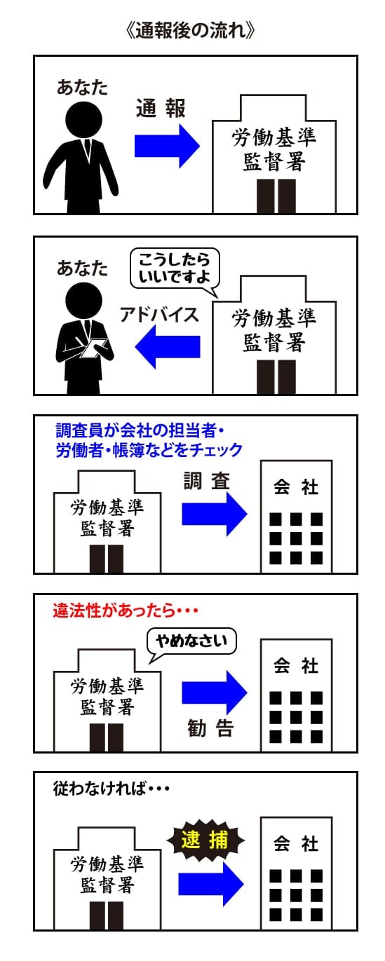 労働基準監督署に通報した場合、解決のために「調査」「是正勧告」「逮捕」などの行動をとってくれることもあります。