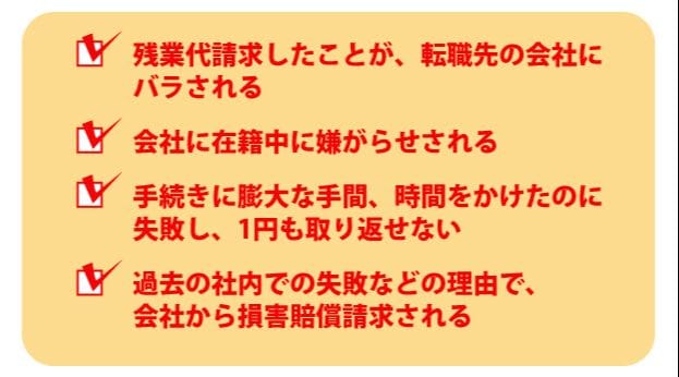 私がこれまで数多くの相談を受けてきた中で、残業代請求において、以下のようなリスクを心配される人が多いです。