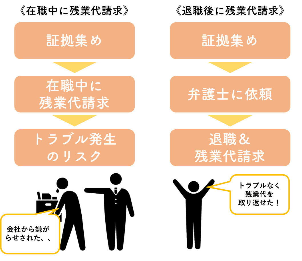 しかし、これまでもお伝えしたように、在職中に請求すると、会社との間で何らかのトラブルや溝を生んでしまう可能性が高いです。
