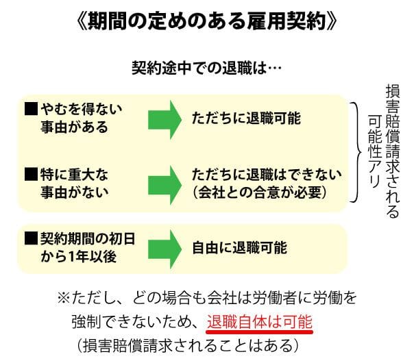 →2週間前までに退職届を提出することで、どのような理由でも退職可能 - 期間の定めのある雇用契約(有期雇用)の場合