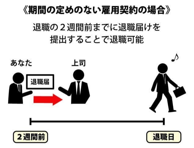 これまでも解説した通り、期間の定めのない雇用契約の場合、2週間前までに退職届を提出することで、法律上は退職(辞職)可能です。